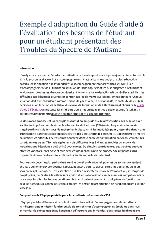 Exemple d'adaptation pour un étudiant TSA du Guide d'aide à l'évaluation des besoins